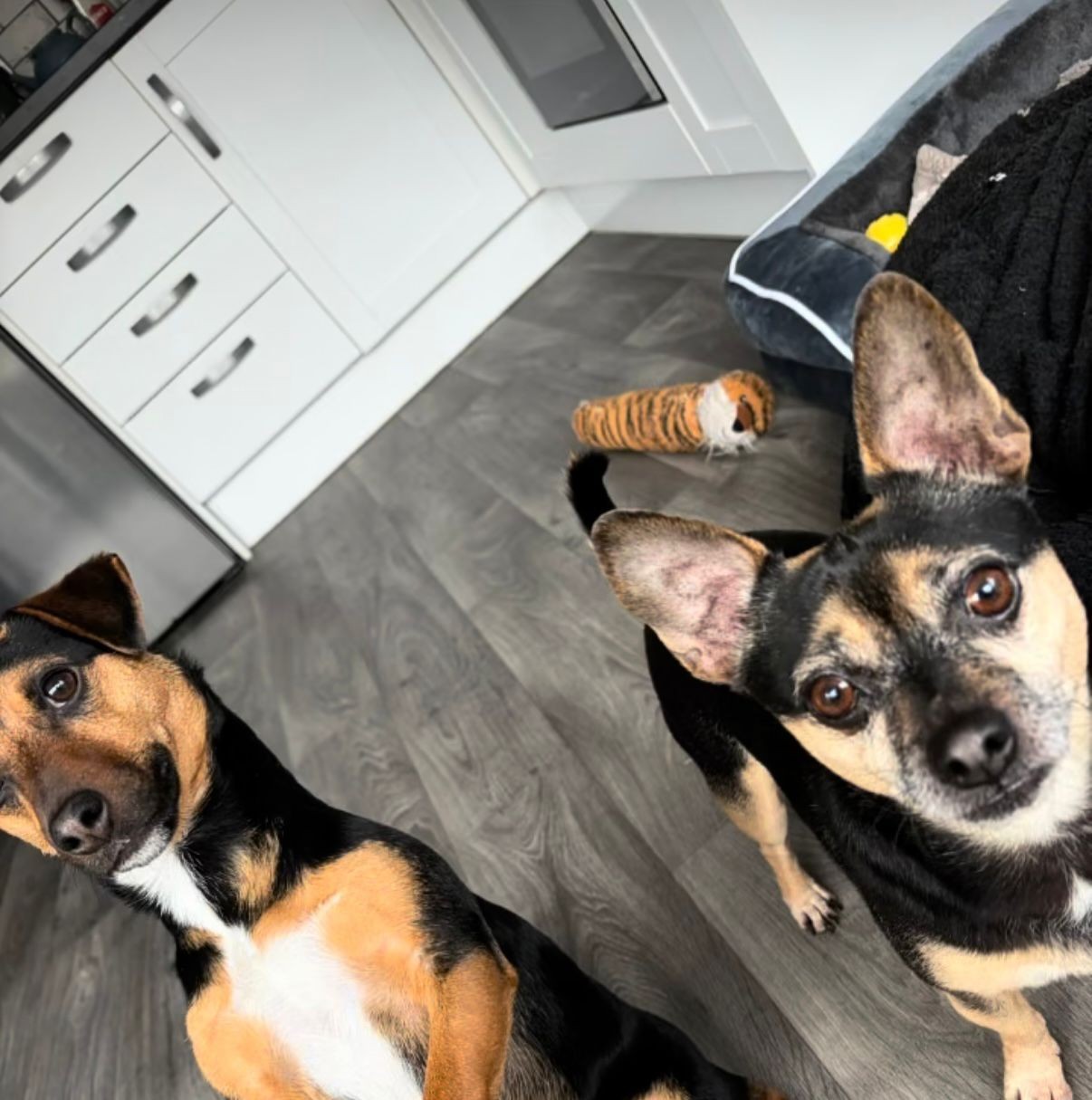 "This Ralph and Milo. Ralph is one and is Jack Russel. Milo is five and is Jack russel cross pug. We are just getting to know each other but they both love their walks. When we get back Ralph is ball mad and Milo loves a cuddle."